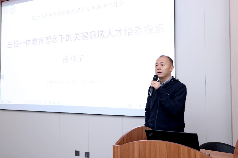 杨祎罡做题为《三位一体教育理念下的关键领域人才培养探索》的报告。他回顾了2024年工物系教学的总体状况,介绍了关键领域人才培养、2024推免和学位创新成果评价,剖析了课程体系、知识图谱建设、课程质量保证等等,他鼓励老师们和企业之间建立联系,寻找课题、开展深度长期合作;鼓励大家多投入,多学习别人长处。