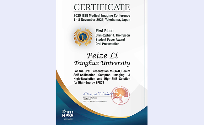 近日,国际电子与电气工程师协会核科学与医学影像2025年会(IEEE Nuclear Science Symposium and Medical Imaging Conference 2025, IEEENSS/MIC 2025)在日本横滨举行。经评审委员会(judging panel)投票,清华大学工程物理系2023级博士生李沛泽作为第一作者的论文获得最佳口头论文奖第一名,论文题目为“自准直-康普顿联合成像:一种高分辨率、高信噪比的高能SPECT解决方案”。