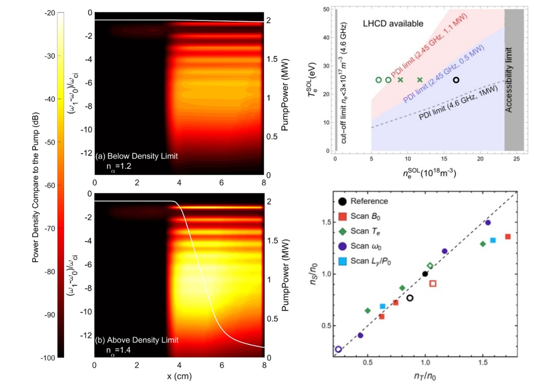 左:模拟重现实验中观测到的LHCD密度阈值及其与参量不稳定性关系