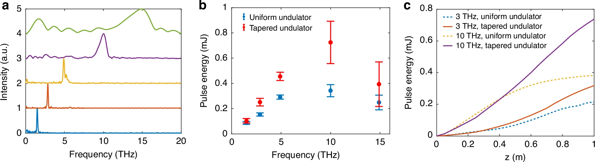 如图2所示,实验在平面波荡器构型下实现了1- 20 THz全频段百微焦量级的脉冲能量输出,在10 THz频点单脉冲能量达到390 µJ,进一步采用渐变型波荡器后,单脉冲能量最高达到900µJ,是迄今为止在该频段窄带太赫兹源中获得的国际上最高辐射能量纪录。