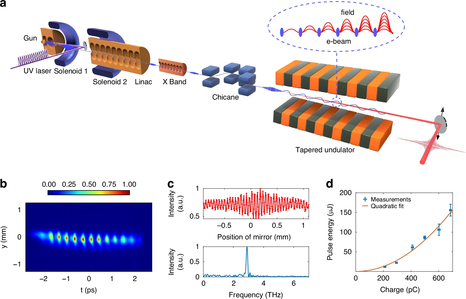 实验装置布局如图1a所示,利用脉冲堆积产生的准平顶紫外激光脉冲串照射在光阴极上,产生具有初始密度调制的电子束脉冲串,随后经过空间电荷振荡过程转化为周期性能量调制,并在后续传输过程中不断加深。通过后续的加速管和X波段谐波腔,可以调整电子束的能量和能量啁啾,下游的磁压缩器将电子束的能量啁啾转化为目标频率的密度调制,并输送到波荡器中驱动超辐射自由电子激光。图 1b 至 1d 分别展示了通过偏转腔测量的电子束纵向密度调制、辐射频谱特性以及辐射脉冲能量随电荷量平方增长的关系。这些结果不仅验证了辐射的相干性,也表明通过提高电荷量,可进一步提升辐射能量。