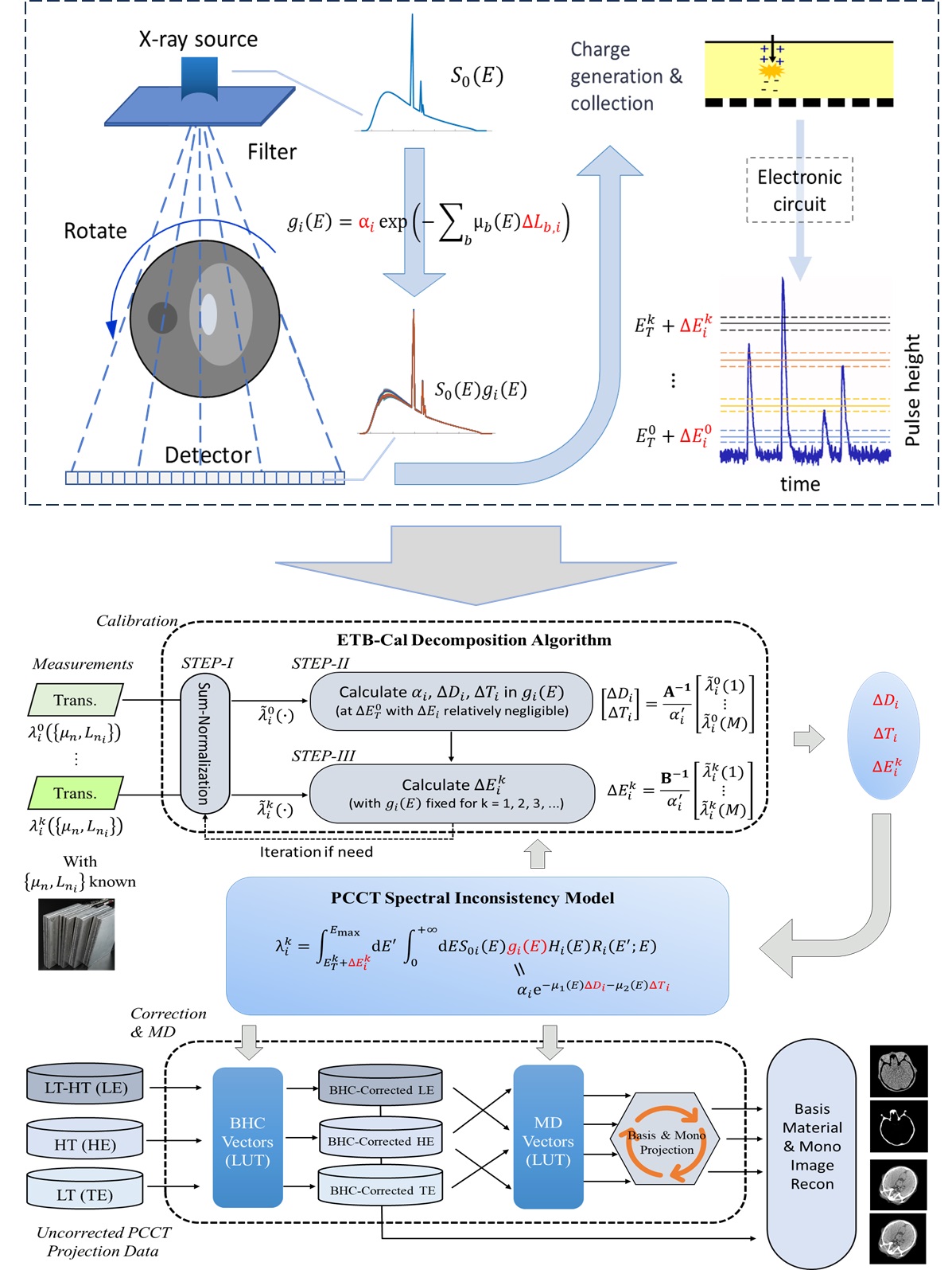 近日,清华大学工程物理系高河伟教授课题组针对光子计数CT(Photon-Counting CT, PCCT)能谱不一致性难题提出了“能量阈值偏差计算器”(Energy-Threshold Bias Calculator, ETB-Cal)这一创新方法,构建了一套基于双因子参数化模型的自适应精细化物理建模校正框架。